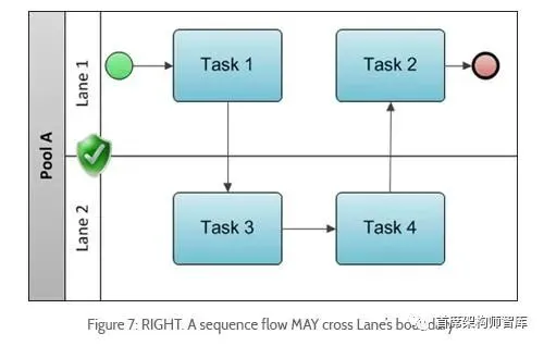 由于池和通道之间的语义差异,BPMN流元素(活动、网关和事件)的连接方式不同,这取决于它们是在池中使用还是在池之间使用。在池中,BPMN流元素以以下方式与序列流连接,如图2所示。
