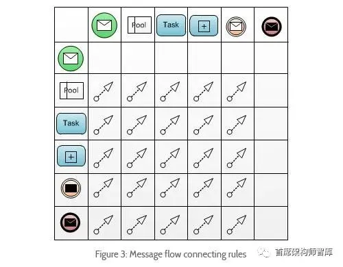 “池之间”通信时只能使用消息流。消息流表示两个池或流程之间的消息交换,包括它们的同步。可以按照图3中的定义使用消息流: