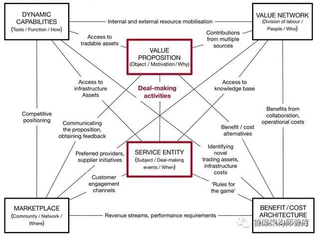 此框架在业务模型上下文中的表示如图4所示。交易活动是核心,服务实体的角色是及时刺激和支持这类活动。达成交易的事件不是连续的,每一个都可能有一些独特的特点。术语服务实体被用来表示活动理论的主体,因为它可能是一个人、一个团队或一个智能代理。谈判交易的性质和交易达成过程可能需要与其他四个要素的互动:市场、公司的动态能力、价值网络和利益/成本架构(例如,以什么成本可以提供什么)。如果我们以这种方式查看所有15个交互,我们将有60个主题需要考虑,这反映了潜在的复杂性。