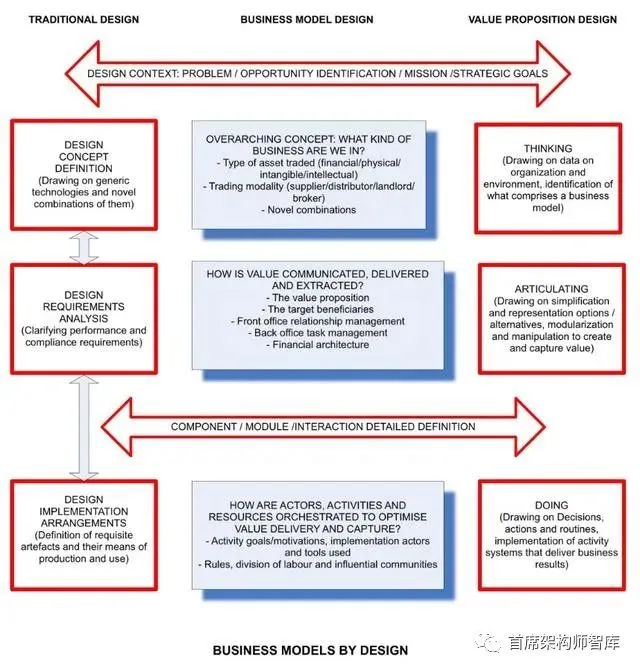 在之前关于设计思维在业务模型设计中的应用的研究中,我们在概念、需求和分析的实现级别上比较了传统设计和(提出的)业务模型观点。图2展示了这一点,以及基于组件(模块化)的业务模型设计视图(Aversa等人,2015)。本文前面的讨论建议我们需要包括一个总体上下文级别,并且在实现的模型和需求级别之间需要有一个子组件定义级别,与Zachman(2003)企业架构框架中采用的多个视点一致。设计流程视图如图2所示。