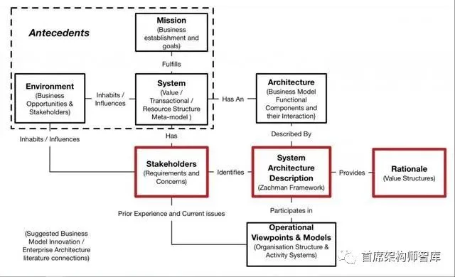 ISO/EIC 42010架构描述框架(ISO, 2007)的调整概述如图3所示。框架的一些元素被显示为表示业务模型前因。核心系统体系结构描述表示了一组详细的需求,并通过来自涉众的输入和多个视点(这些视点代表了基于先前经验和模型的知识库)、体系结构的一般形式和选择特定设计的基本原理来提供信息。