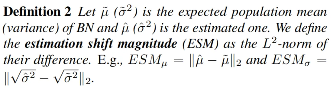 设为BN的期望均值(方差),是估计的BN的期望均值(方差)。将估计偏移幅度(ESM)定义为它们的差值的l2-范数。例如,和。