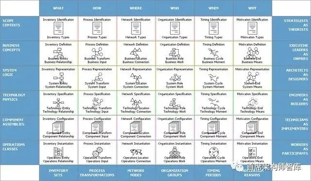Zachman框架是一种用于企业描述表示的二维分类方案,它由包含36个单元格的矩阵构成,每个单元格都关注企业的一维或透视图。行通常表示为系统开发过程中涉及的不同观点,而列表示组织中涉及的涉众的不同观点。