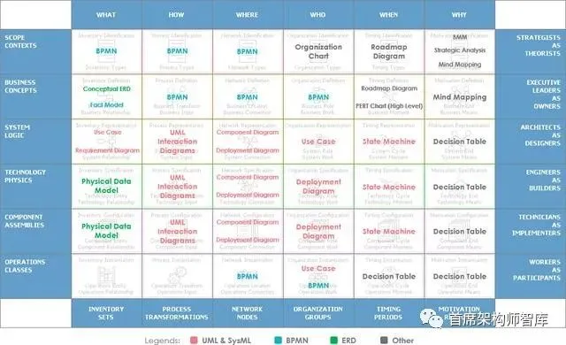 Zachman框架可以提供关于在过程的不同阶段需要什么类型的工件的指导。根据Zachman框架提供的基本结构,组合后的应用程序可以产生可预测的、可重复的结果。下图展示了Zachman框架的本体结构以及UML、BPMN、ERD等图的组合使用。