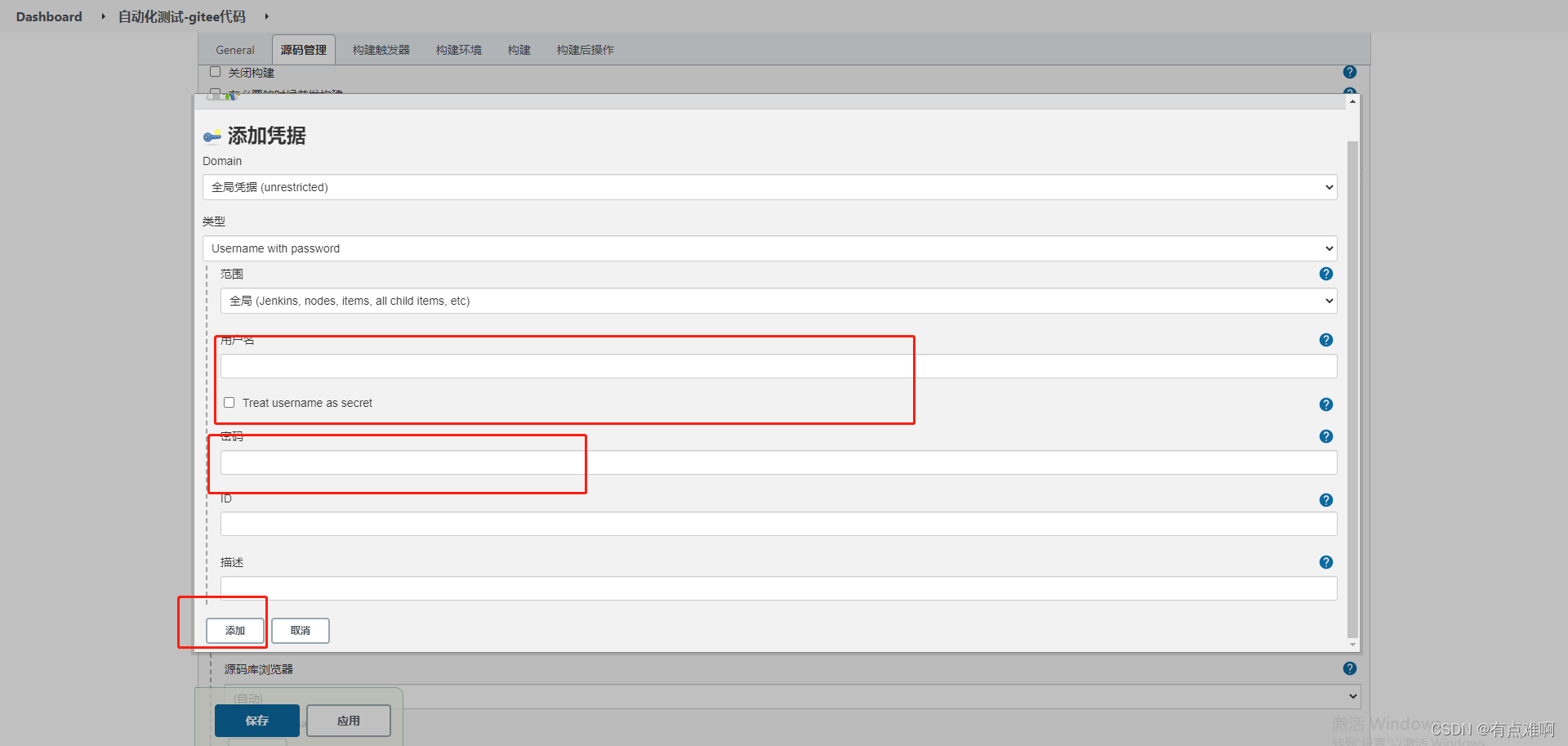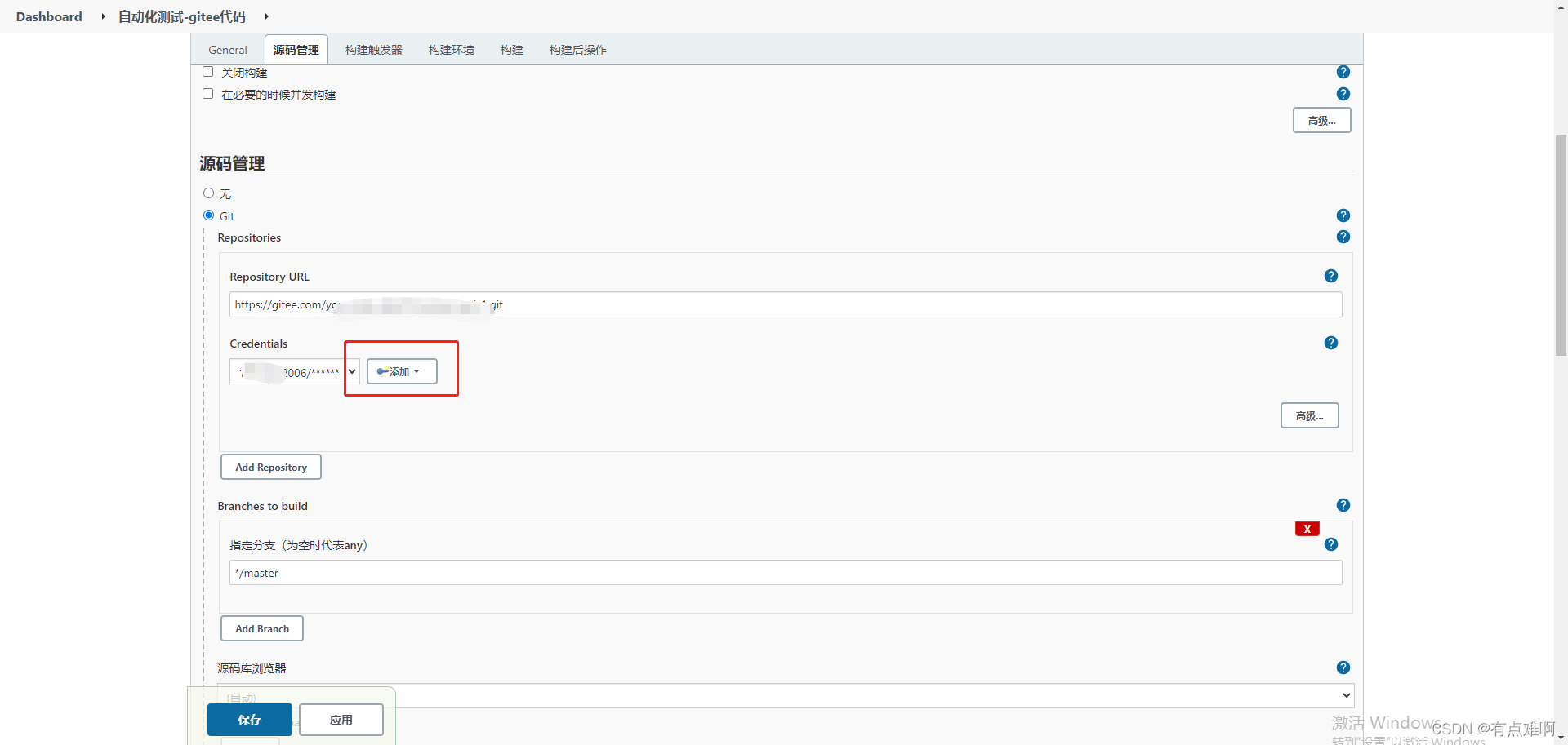 配置仓库地址和账号密码,第一次没有账号密码点击添加