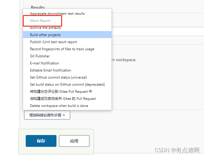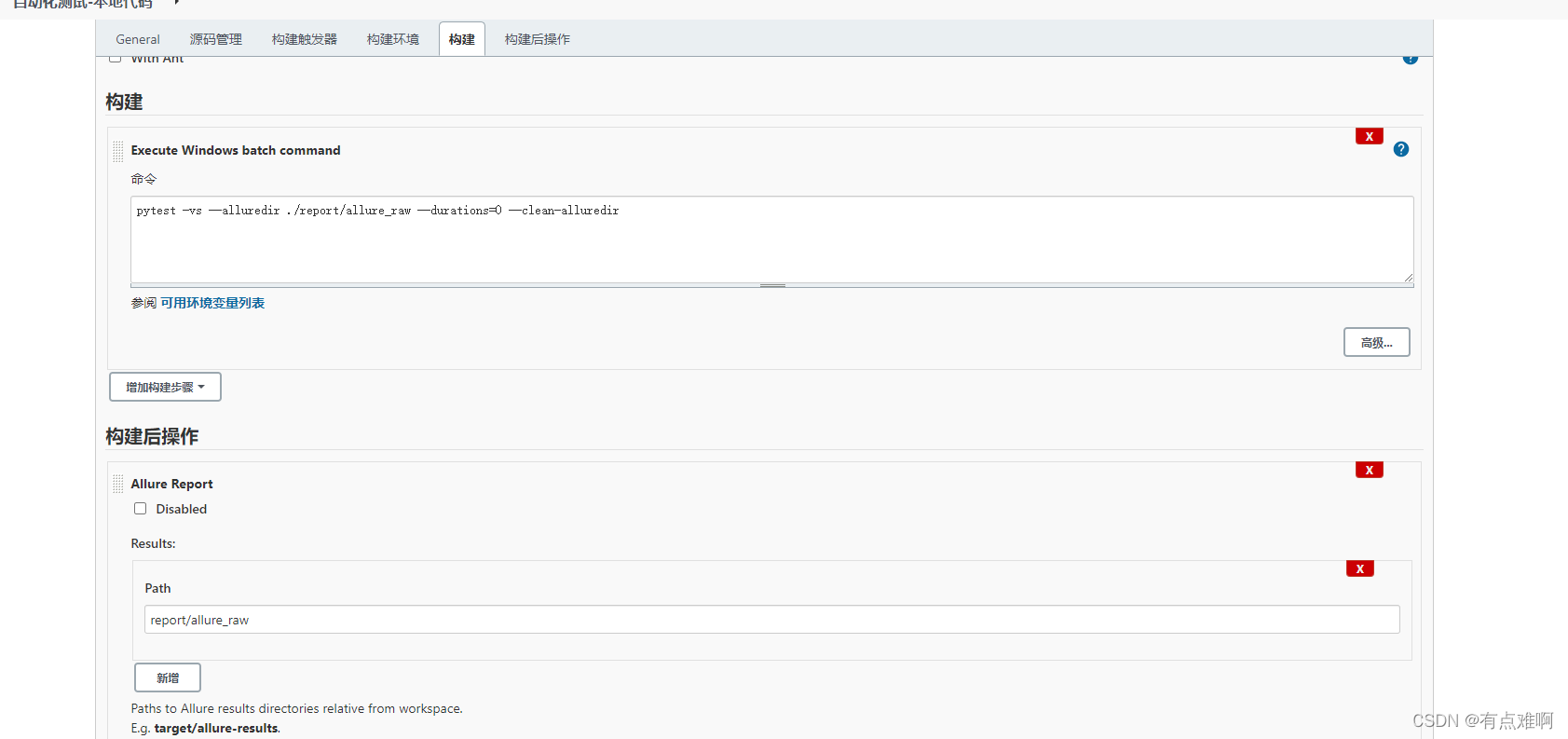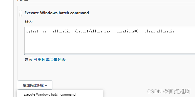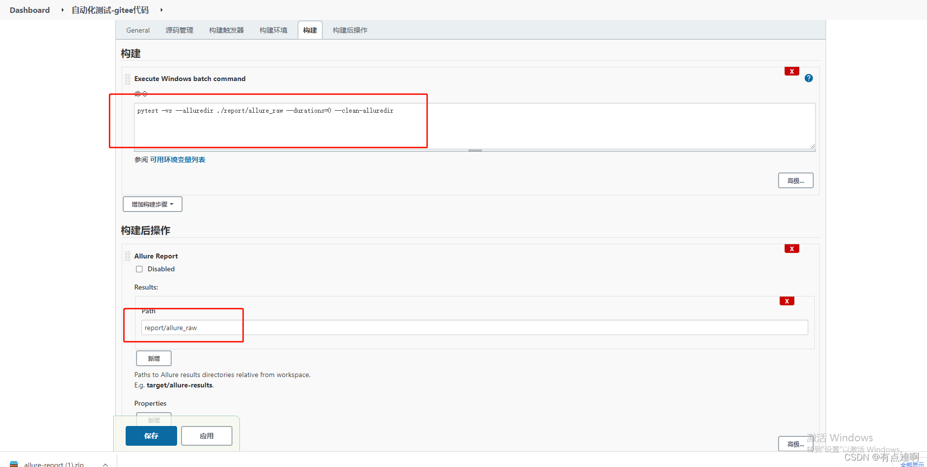 再次点击设置配置pytest的运行命令和获取报告的路径,保存搞定,直接发起构建,不出意外就会产生报告