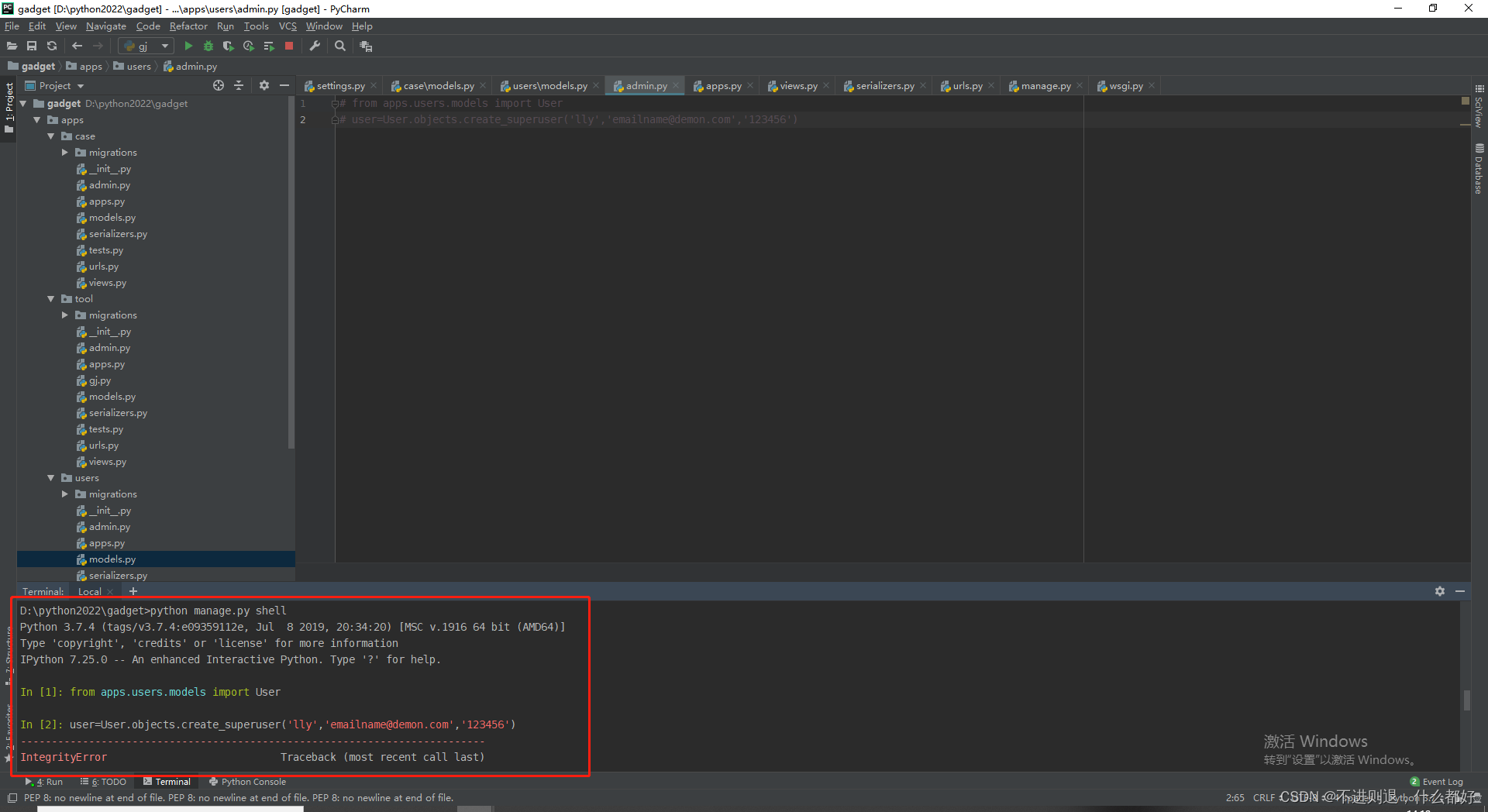 导入自己重写的用户模型创建超级用户,虽然报错但是确实创建成功了,可以登录admin后台,数据库也写入成功