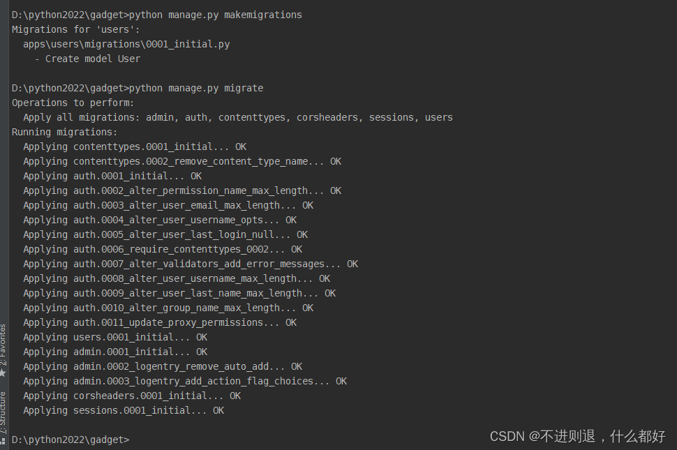 python manage.py migrate # 根据数据库迁移文件生成对应SQL语句并执行