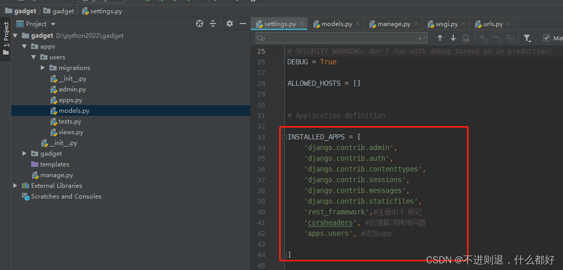 INSTALLED_APPS = [ 'django.contrib.admin', 'django.contrib.auth', 'django.contrib.contenttypes', 'django.contrib.sessions', 'django.contrib.messages', 'django.contrib.staticfiles', 'rest_framework',#注册drf 标记 'corsheaders', #后端解决跨域问题 'apps.users', #添加app ]