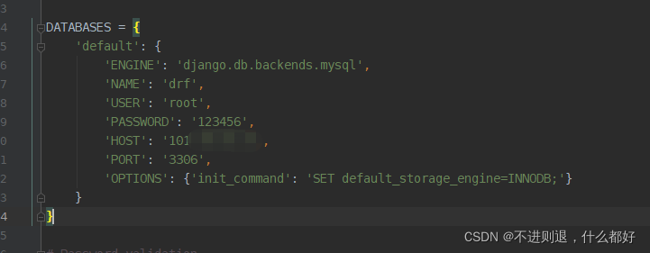DATABASES = { 'default': { 'ENGINE': 'django.db.backends.mysql', 'NAME': 'gadget', 'USER': 'root', 'PASSWORD': '123456', 'HOST': '101.xxxxxxx', 'PORT': '3306', 'OPTIONS': {'init_command': 'SET default_storage_engine=INNODB;'} } }