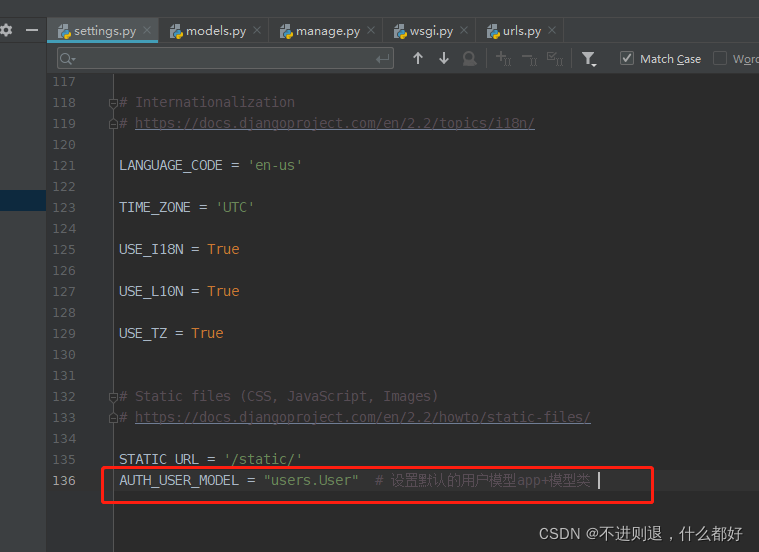 AUTH_USER_MODEL = "users.User" # 设置默认的用户模型app+模型类