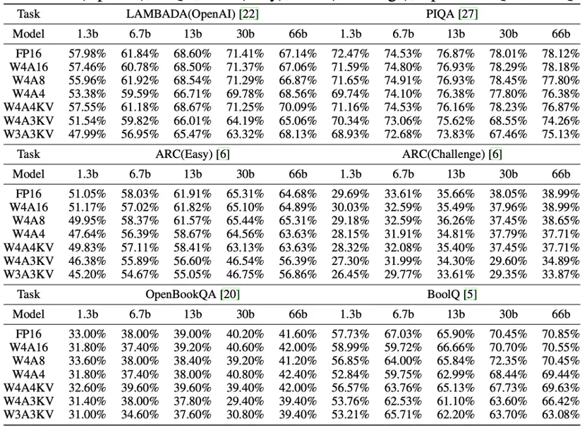 作者在三种不同的位宽配置下评估了 OPT 的性能:W4A16、W4A8 和 W4A4。此外,作者还开发了一种新的量化方案,W4A4KV、W4A3KV 和 W3A3KV,只对主要内存的消耗 —— 键缓存和值缓存(Key/Value Cache)进行量化。根据表格,可以得出以下观察结果:一般而言,随着激活量化位宽的减少,模型的性能会下降。但在大多数情况下,这种退化并不显著。对于某些任务,性能下降不到 1%,甚至有所提高。