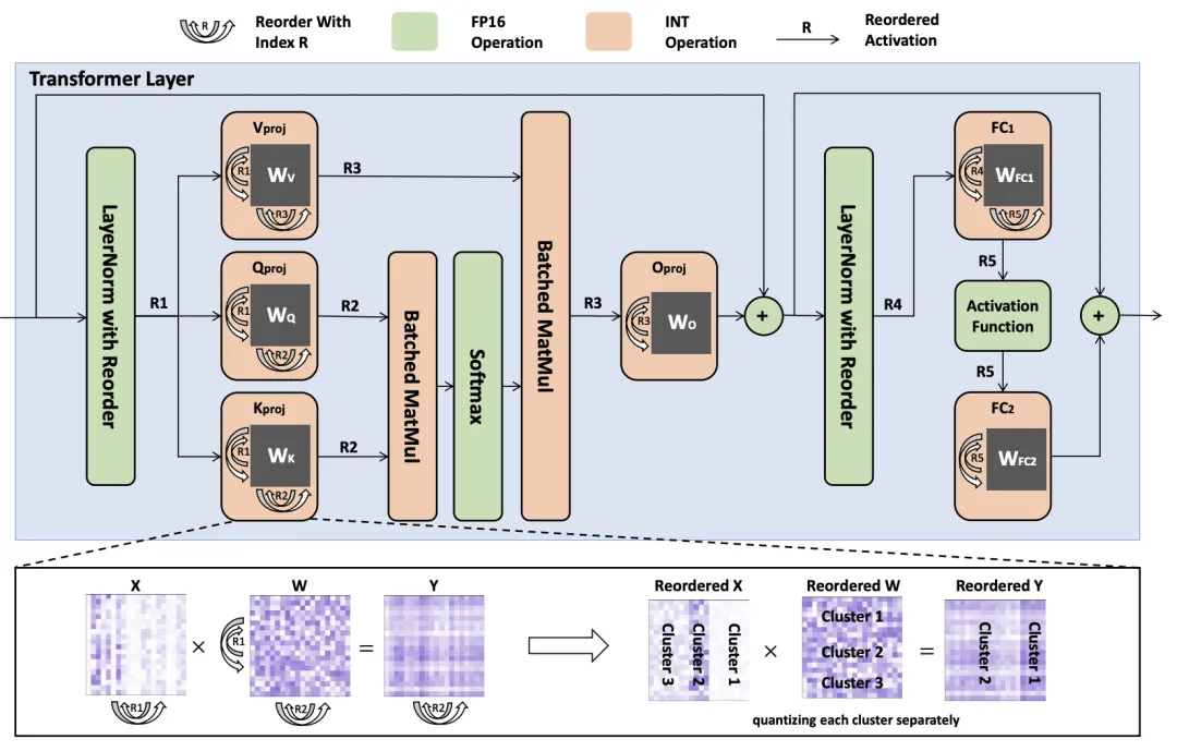 图 3:一重排权重和激活的量化 Transformer 层的推断过程失意图。重排索引用符号 R1 到 R5 表示。