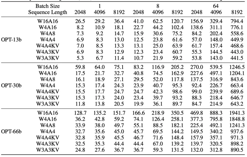 表中展示了不同设置下的内存使用情况,可以发现较低比特的激活可以显著减少内存使用,特别是在批次大小和序列长度较大的情况下。具体而言,当批次大小为 64,序列长度为 8192 时,OPT-66b 下的 W4A4 配置相比 W4A16 配置节省了超过 900GB 的内存。因此,采用 RPTQ 对激活量化可以极大地减少在长文本任务或大批量场景中的内存压力。