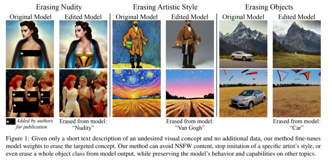 如何尽量避免模型输出这些内容呢?在最近的一篇论文中,来自美国东北大学、麻省理工学院的作者提出了一种在预训练之后有选择地从文本条件模型的权重中删除单个概念的方法。