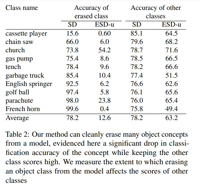 表 2 中展示了原始 Stable Diffusion 模型和 ESD-u 模型在训练过程中擦除目标类时分类准确性的对比结果,同时展示了在生成剩余的九个类时的分类准确性。结果表明,ESD 能够在大多数情况下有效地去除目标类,尽管有一些类别(比如教堂)比较难去除。但未被去除的类别的分类准确性仍然很高,即使某些情况下会有一些干扰,例如,去除「法国圆号」会对其他类别造成明显的失真。作者在补充材料中提供了物体去除后的视觉效果图像。