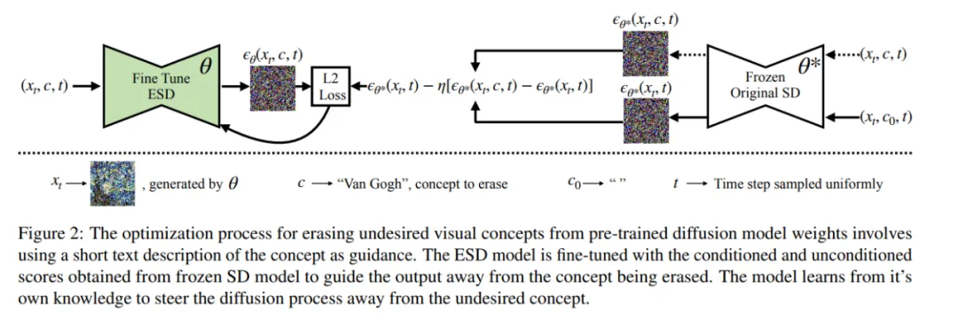 ESD 通过编辑预训练的扩散 U-Net 模型的权重 θ 去除特定的风格或概念。ESD 是受到了无分类器指导方法和基于分数的合成等工作的启发。具体来说,使用无分类器指导的原则来训练扩散模型,将模型的分数从想要消除的特定概念 c 中擦除,例如「Van Gogh」这种词语。利用预训练模型对概念的认知,同时让其学习将微调输出的分布的质量从该概念中移除。