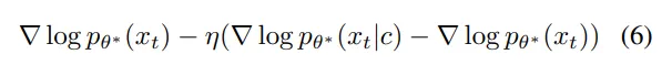 这可以解释为具有来自分类器 pθ(c|xt) 的梯度的无条件 score。为了控制条件性的影响,作者为分类器梯度引入了一个指导因子 η