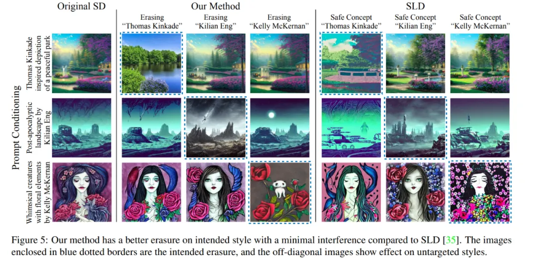 另一个问题是,文本到图像模型所模仿的作品可能是受版权保护的。AI 生成的艺术作品不仅在质量上与人类生成的艺术相媲美,而且还可以忠实地复制真实艺术家的艺术风格。Stable Diffusion 和其他大型文本到图像合成系统的用户发现,诸如「art in the style of [artist]」之类的 prompt 可以模仿特定艺术家的风格,从而有可能产生侵权的作品。此前,也正是因为多位艺术家的担忧,导致了一场针对 Stable Diffusion 制作主体的法律诉讼 —— 艺术家指控 Stable Diffusion 侵犯了他们的作品。为了保护艺术家,最近的一些工作尝试于在线发布艺术作品之前对艺术作品应用对抗干扰,以防止模型模仿它。然而,这种方法并不能从预训练模型中删除模型本已学习到的艺术风格。
