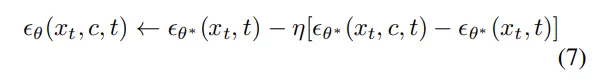 作者希望通过反转的行为来否定概念 c,因此使用负面版本的指导来训练 θ。此外,受到无分类器引导的启发,作者将等式 5 的 RHS 从分类器转换为条件扩散。