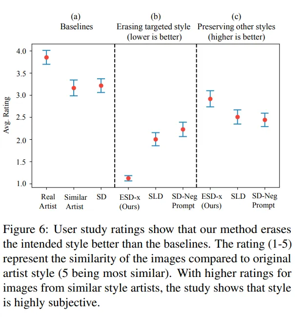 图 5 展示了相关定性结果,作者还进行了用户研究(图 6)以衡量人类对艺术风格去除效果的感知。最终的实验结果验证了该观察结果,即模型已经去除了特定艺术家的风格,同时保留了 prompt 内容和结构(图 5),并且对其它艺术风格的干扰最小。
