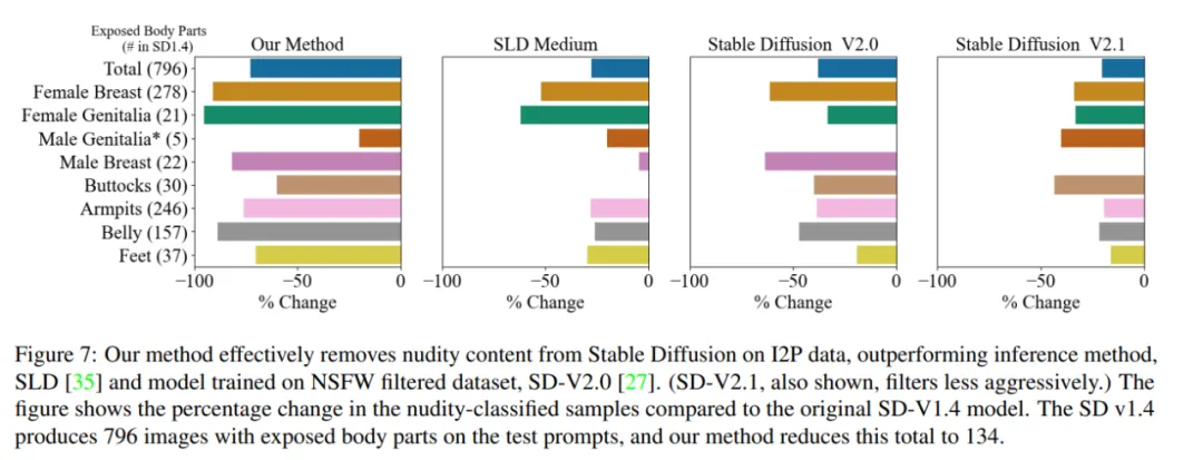 在图 7 中,与 Stable Diffusion v1.4 相比,裸体分类样本的百分比变化。作者通过使用推理方法(SLD)和过滤再训练方法(SD V2.0)研究了 ESD 的有效性。对于所有模型,使用的都是由 I2P prompt 生成 4703 张图像。他们使用 Nudenet 检测器将图像分类为各种裸体类别。结论是,在弱擦除比例 η=1 时,在所有类别中,ESD 方法在擦除裸体方面效果更显著。