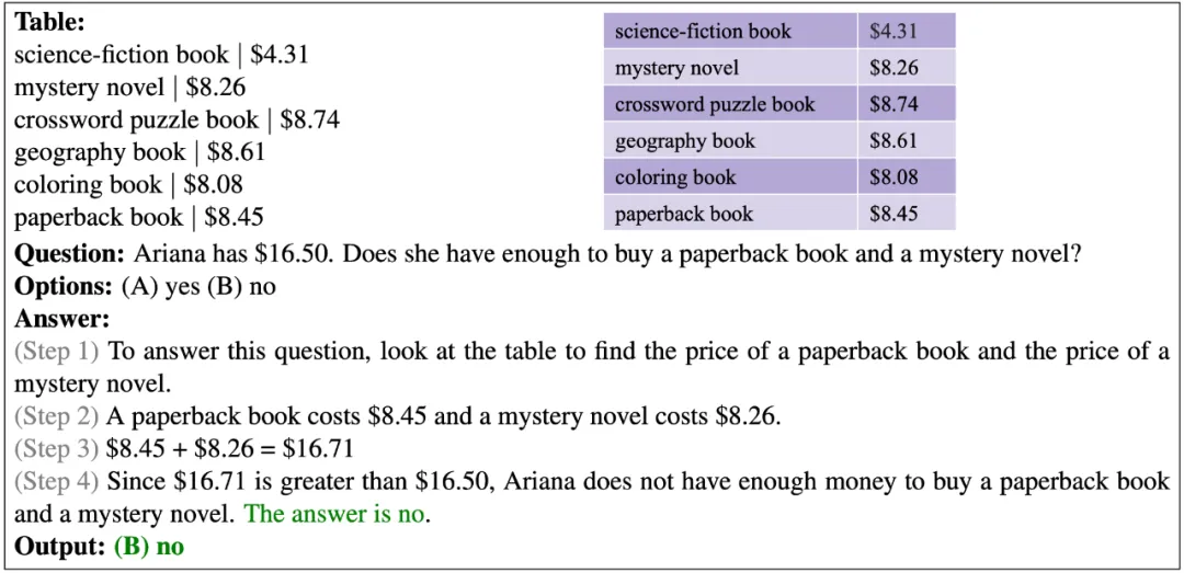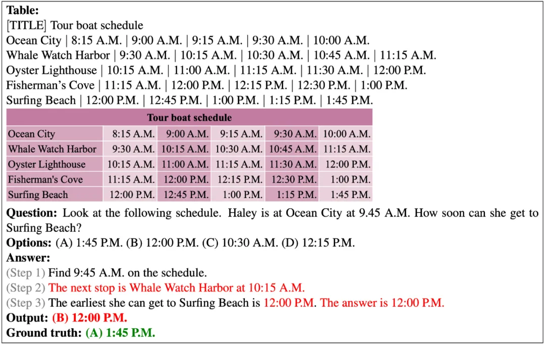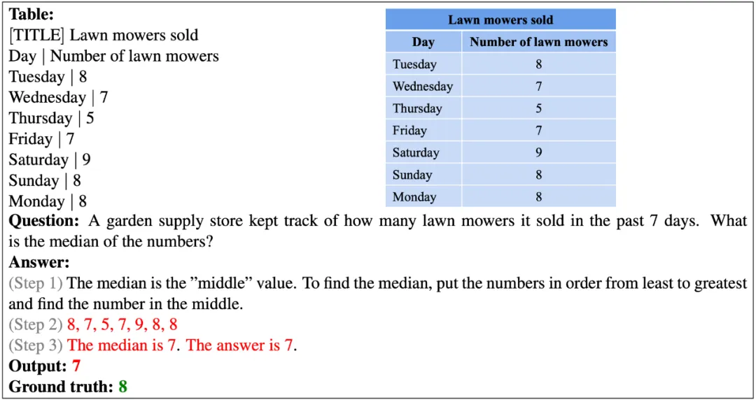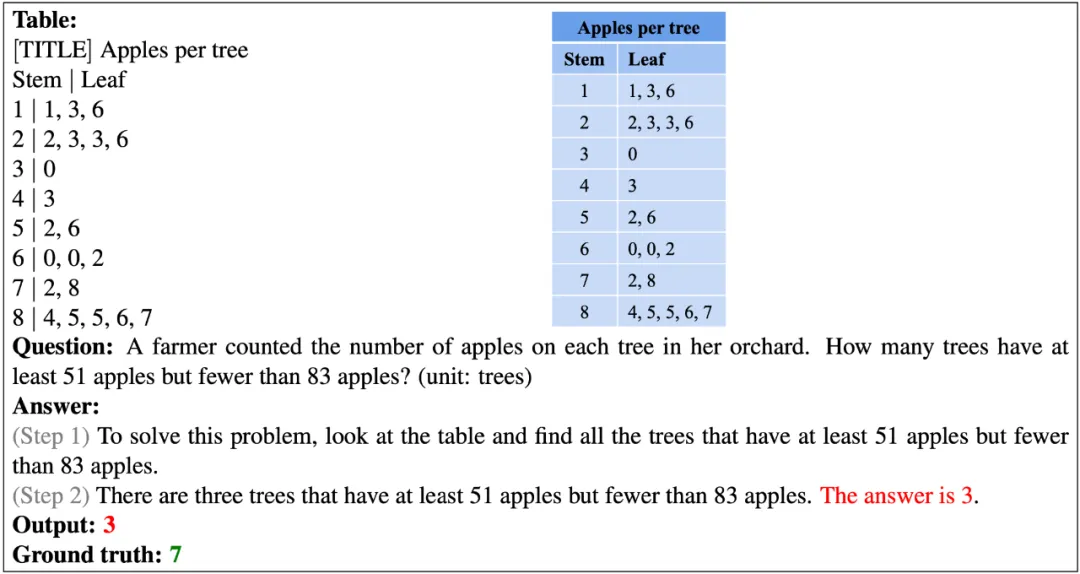 在以下的例子中,问题提供了一个抽象的茎叶表。模型无法理解这个特定领域的表格,并且缺乏高级逻辑推理能力从而得到了错误的答案。