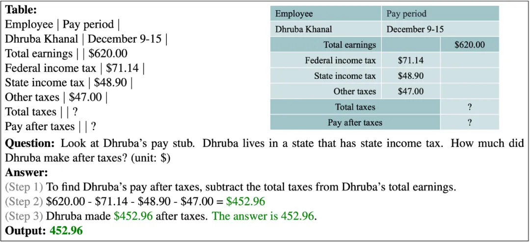在如下的例子中,模型被要求理解一个税收报告,并计算扣税后的工资。