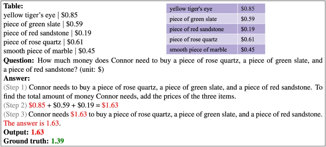 以下展示了 PromptPG 对自由文本问题的错误预测。模型检索到了错误的玫瑰石英价格,从而错误计算了三个物品的成本总和。