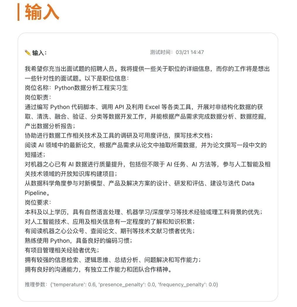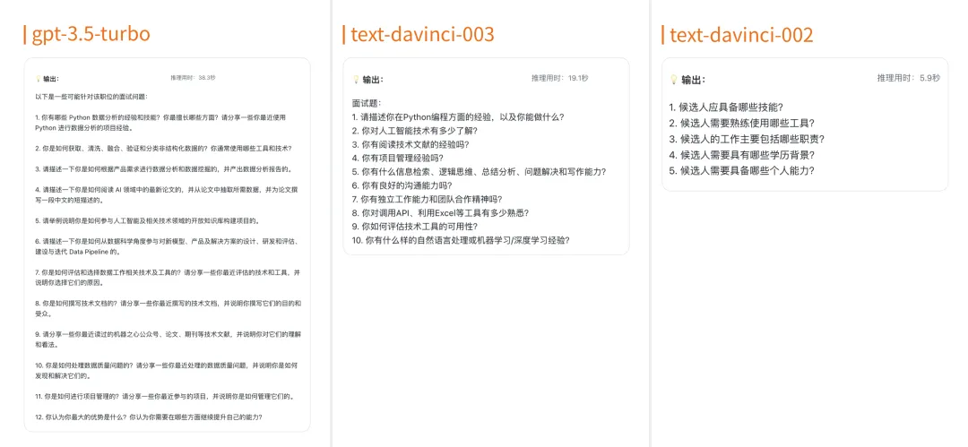 gpt-3.5-turbo 模型生成的面试问题涵盖了职位描述中的主要职责和要求,适应面试场景。问题从多个角度深入了解候选人的能力和经验,包括工作经验、项目经验、技能和个人特质等多个方面,具有较高的针对性。问题具有实际价值,与职位匹配度较高,能有效评估候选人的能力。text-davinci-003 模型生成的面试问题涵盖了职位描述中提到的多个要求和技能,但有些问题表述不具体、条理不清晰。需要更细分领域,否则不能全面衡量候选人的能力。模型生成的问题涵盖了候选人的专业背景、项目经验、技能和个人品质,但有些问题可以更具体和深入,以便更好地评估候选人的能力。
