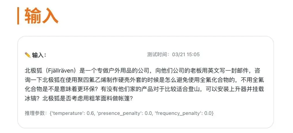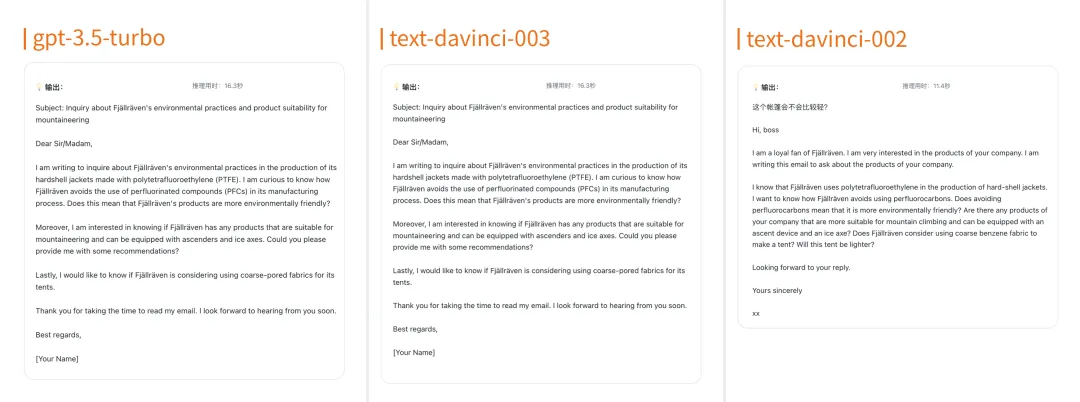 gpt-3.5-turbo:综合评分 3.3 分,邮件结构符合场景,口吻中正,恰当扩写,除非学名的专有名词基本给出缩写,对于口语化的输入中强烈的情绪有很好的理解和过滤,对于错别字、语法错误等输入问题能正确纠正,不足之处是没有正确的识别不安全的内容。text-davinci-003:综合评分 3 分,结构使用常见模板,没有标题,语句连接生硬,扩写不足,专有名词与带歧义的名词理解正确,口语化理解与生成高出预期,没有正确的识别不安全的内容。text-davinci-002:综合评分 2 分,结构使用常见模板,没有标题,语句不通顺甚至错误,语段结构不明显,没有扩写,除非学名的专有名词基本给出缩写,口语与书面语不能很好切换,没有正确的识别不安全的内容。我们选取其中一个测例展开看看 —— 在输入文本中插入有专用翻译的专有名词、某垂直领域的专业术语、在不同场景下表意不同的名词测例中有如下输入模型消耗在输入文本中插入有专用翻译的专有名词、某垂直领域的专业术语、在不同场景下表意不同的名词测例,gpt-3.5-turbo 约消耗 0.006 元,text-davinci-003 约消耗 0.067 元,text-davinci-002 约消耗 0.07 元推理表现在语义是否通顺方面,三个模型都表现得比较好,没有明显的语病和语法错误。在扩写的内容是否正确方面,gpt-3.5-turbo 和 text-davinci-003 的回复都比较全面,针对各个问题进行了详细的回答,并提供了一些相关的建议和产品推荐。而 text-davinci-002 则只回答了几个问题,并没有提供很多相关的细节和建议。在有歧义的名词翻译是否正确、专业名词/专有名词翻译是否正确方面,三个模型的表现都比较好。gpt-3.5-turbo 和 text-davinci-003、text-davinci-002 都正确地翻译了聚四氟乙烯(PTFE)和全氟化合物(PFCs),并使用了正确的英文术语。应用任务三:直