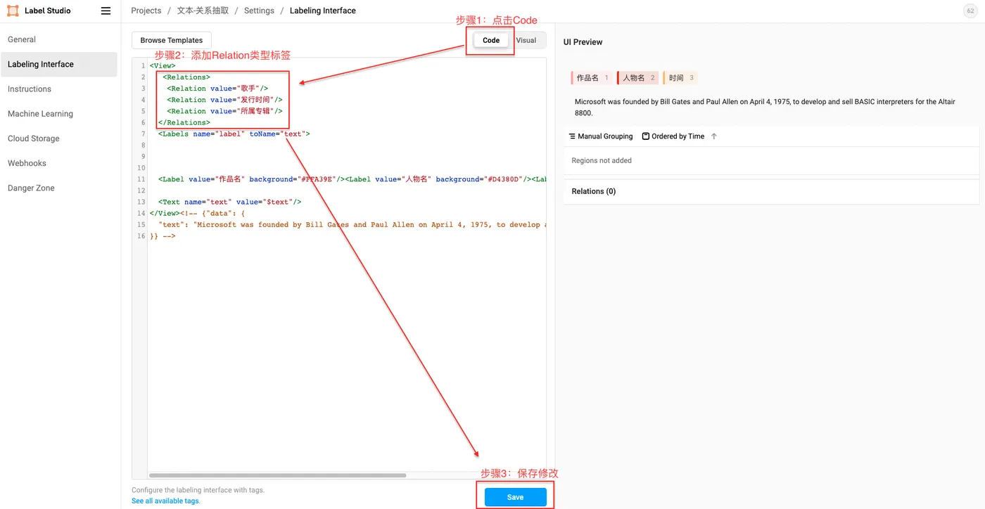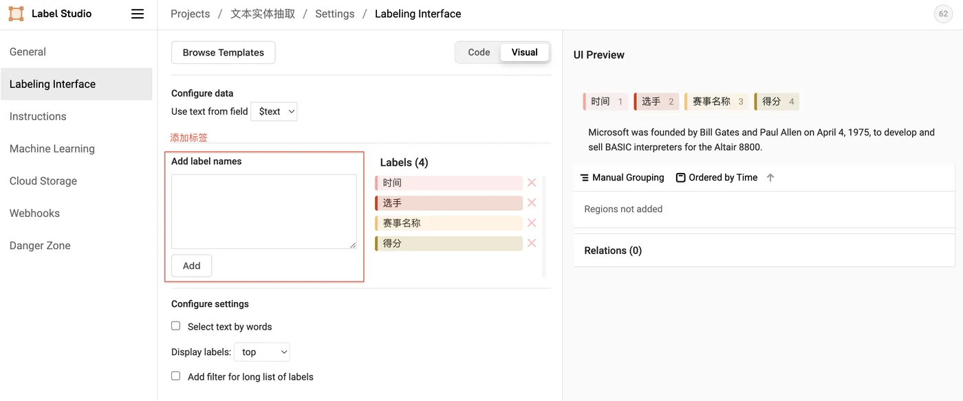 - 添加标签(也可跳过后续在Setting/Labeling Interface中配置)
