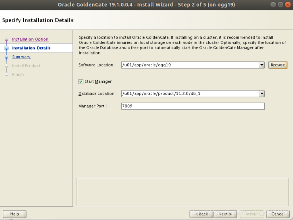 mkdir /u01/app/oracle/ggs/19.1 -p mv 191004_fbo_ggs_Linux_x64_shiphome.zip /u01/app/oracle/ggs/19.1/ unzip 191004_fbo_ggs_Linux_x64_shiphome.zip [oracle@ogg19 ~]$ cd fbo_ggs_Linux_x64_shiphome/Disk1/ [oracle@ogg19 Disk1]$ ll total 16 drwxr-xr-x 4 oracle oinstall 4096 10月 18 2019 install drwxrwxr-x 2 oracle oinstall 4096 10月 18 2019 response -rwxr-xr-x 1 oracle oinstall 918 10月 18 2019 runInstaller drwxr-xr-x 12 oracle oinstall 4096 10月 18 2019 stage [oracle@ogg19 Disk1]$ ./runInstaller Starting Oracle Universal Installer... Checking Temp space: must be greater than 120 MB. Actual 42866 MB Passed Checking swap space: must be greater than 150 MB. Actual 3071 MB Passed Checking monitor: must be configured to display at least 256 colors. Actual 16777216 Passed Preparing to launch Oracle Universal Installer from /tmp/OraInstall2020-09-30_02-42-53PM. Please wait ...[oracle@ogg19 Disk1]$ You can find the log of this install session at: /u01/app/oraInventory/logs/installActions2020-09-30_02-42-53PM.log