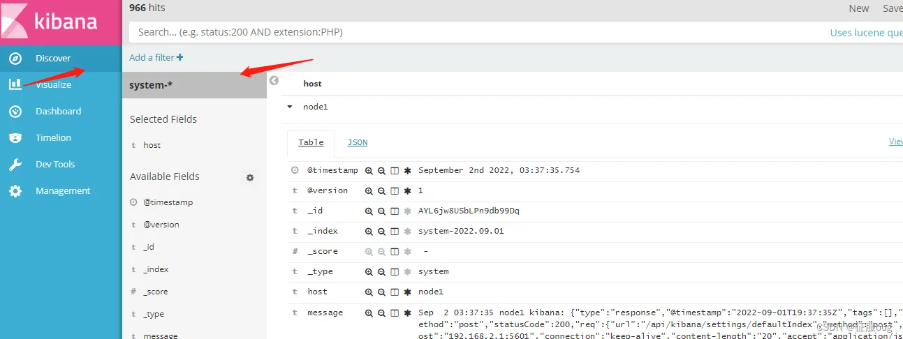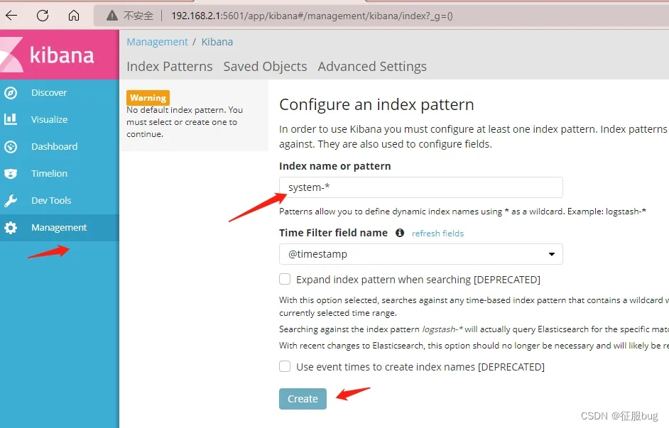 验证kibana,通过浏览器访问http://192.168.2.1:5601,第一次登录需要添加一个elasticsearch索引,添加前面创建索引system-*。