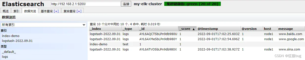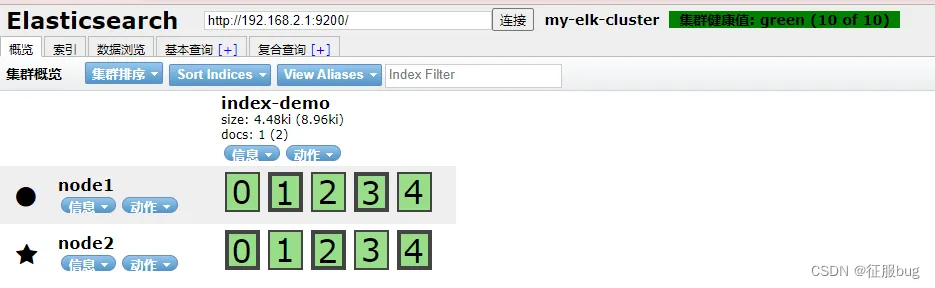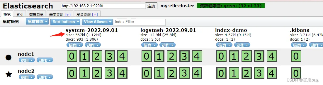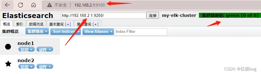 通过elasticsearch-head查看elasticsearch信息。通过浏览器访问http://192.168.2.1:9100/,并连接群集