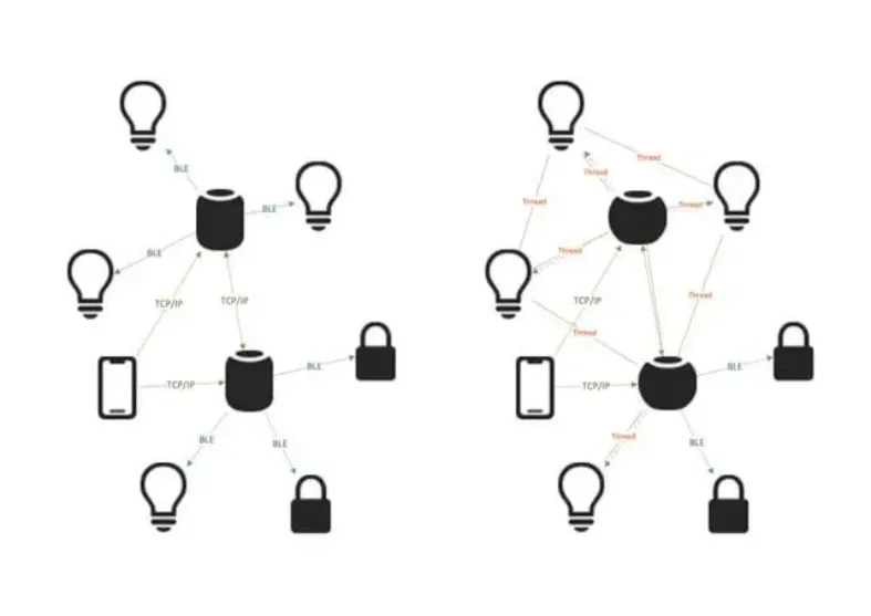 引入 Thread 前后的蓝牙设备拓扑图