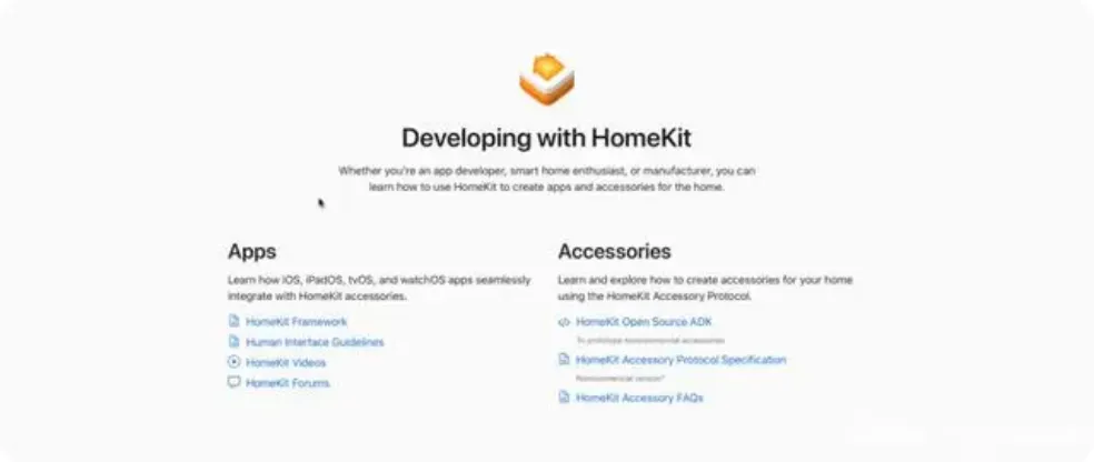 Apple 开发者网站中列出的多个 HomeKit 相关的板块