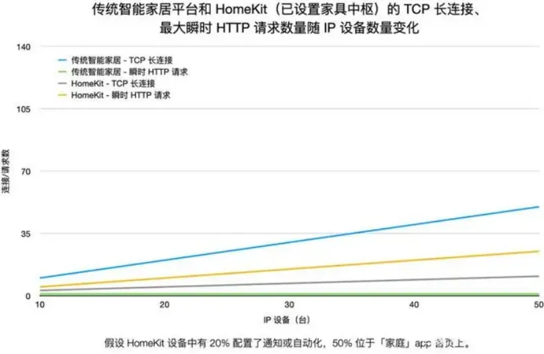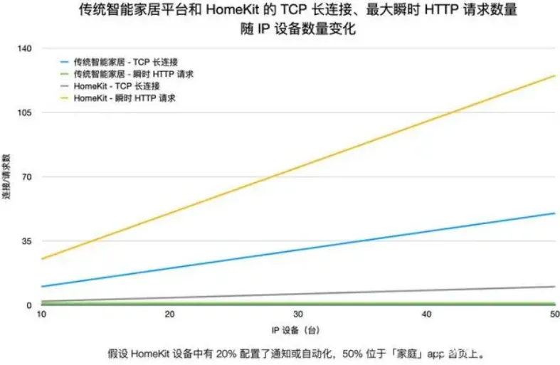 传统智能家居平台和 HomeKit(已设置家具中枢)的长连接、最大瞬时请求数量随 IP 设备数量变化