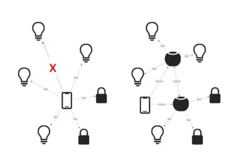 引入家居中枢前后的蓝牙设备拓扑图