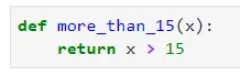 让我们看看这个在行动中。我已经声明了一个名为 more_than_15() 的函数,顾名思义,如果作为参数给出的项目大于 15,它将返回 True: