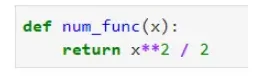 让我们看看它的实际效果。我将声明一个名为 num_func() 的函数,它将一个数字作为参数。该数字被平方并除以 2 并原样返回。请注意,操作是任意选择的,您可以在函数内做任何您想做的事情: