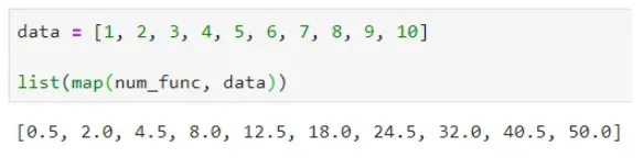 现在让我们声明一个数字数组,我们要在其上应用 num_func()。请注意 map() 本身将返回一个地图对象,因此您需要将其转换为列表: