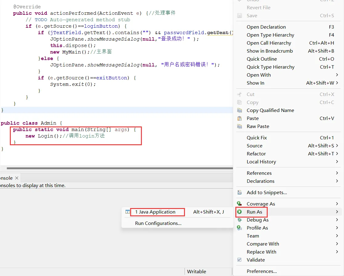 去每个类里找里面有个main方法的,如上所示,这就是主类,也就是启动类,然后找到了这个类后在空白处右键点击Run As,然后选中第一个Java Application就可以启动成功!