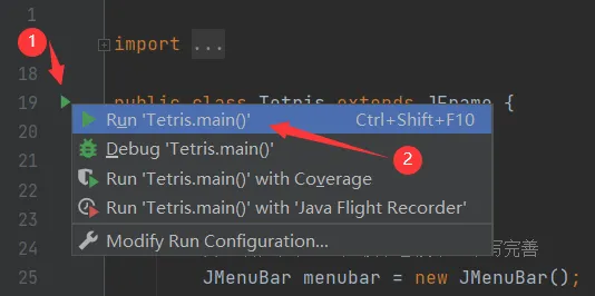 找到这个主类后,点击代码里的绿色箭头,选择第一个运行程序,如下图所示