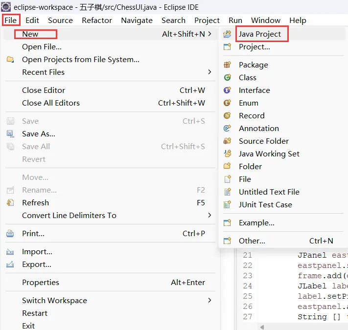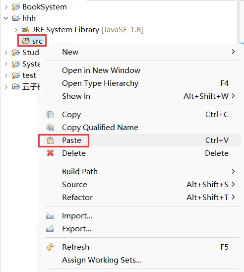 4、由于技术开发的时候都是用的IDEA软件,所以在把IDEA写的系统导入eclipse的时候不能直接导入,要找到src目录的源代码,然后把每个源码文件(后缀是.java的文件)通过记事本的方式打开,然后复制到上面新创建的Java项目的src目录下,注意这里src目录下有多少个.java后缀的文件就需要导入多少个到eclipse刚才新建的项目里(这里是hhh项目),重复这样的复制粘贴操作!