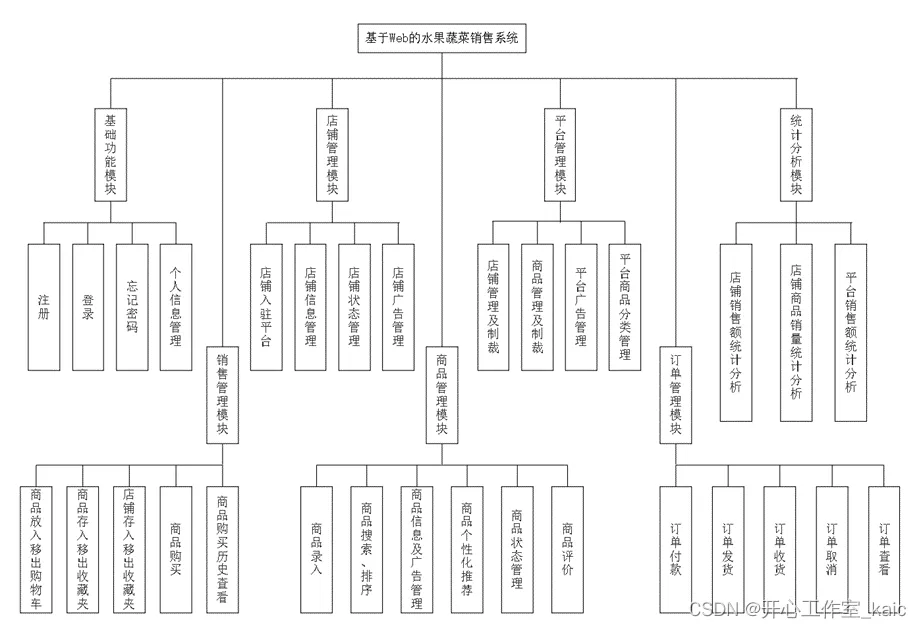 The system consists of seven functional modules: basic function, shop management, commodity management, sales management, order management, platform management, statistics and analysis. The system is in line with the sales logic of fruits and vegetables, can meet the needs of the public for online sales platform, and match the design objectives and actual needs.