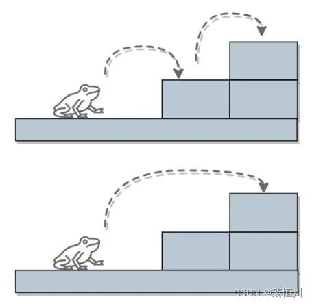 一只青蛙可以一次跳 1 级台阶或一次跳 2 级台阶,例如:跳上第一级台阶只有一种跳法:直接跳 1 级即可。跳上两级台阶,有两种跳法: 每次跳 1 级,跳两次; 或者一次跳 2 级.