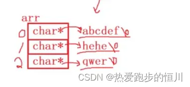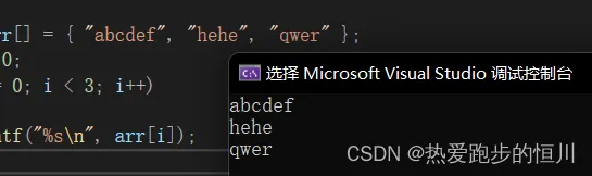 int main() { char* arr[] = { "abcdef", "hehe", "qwer" }; int i = 0; for (i = 0; i < 3; i++) { printf("%s\n", arr[i]); } return 0; }