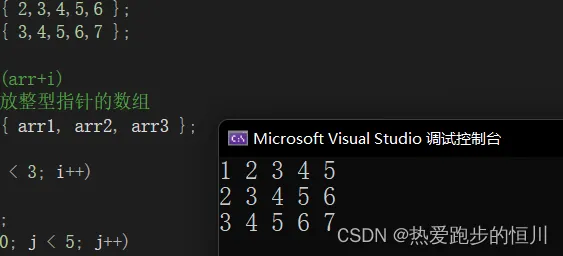 int main() { int arr1[] = { 1,2,3,4,5 }; int arr2[] = { 2,3,4,5,6 }; int arr3[] = { 3,4,5,6,7 }; //arr[i] == *(arr+i) //arr是一个存放整型指针的数组 int* arr[] = { arr1, arr2, arr3 }; int i = 0; for (i = 0; i < 3; i++) { int j = 0; for (j = 0; j < 5; j++) { //printf("%d ", arr[i][j]); printf("%d ", *(arr[i]+j)); } printf("\n"); } return 0; }