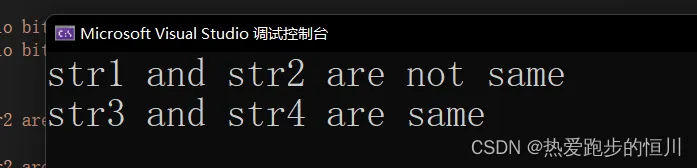 这里str3和str4指向的是一个同一个常量字符串。C/C++会把常量字符串存储到单独的一个内存区域,当几个指针。指向同一个字符串的时候,他们实际会指向同一块内存。但是用相同的常量字符串去初始化不同的数组的时候就会开辟出不同的内存块。所以str1和str2不同,str3和str4不同。
